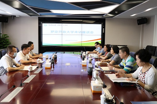 9月18日,罗定开放大学支部书记、校长黄铭锋,副校长胡朝,教务处主任陈剑刃一行3人来省校汇报工作。罗海鸥书记、刘文清校长、王宜奋副校长出席座谈会。党政办、招生与合作处、规划与体系建设处、教务处、国开业务部等有关部门负责人参加座谈。