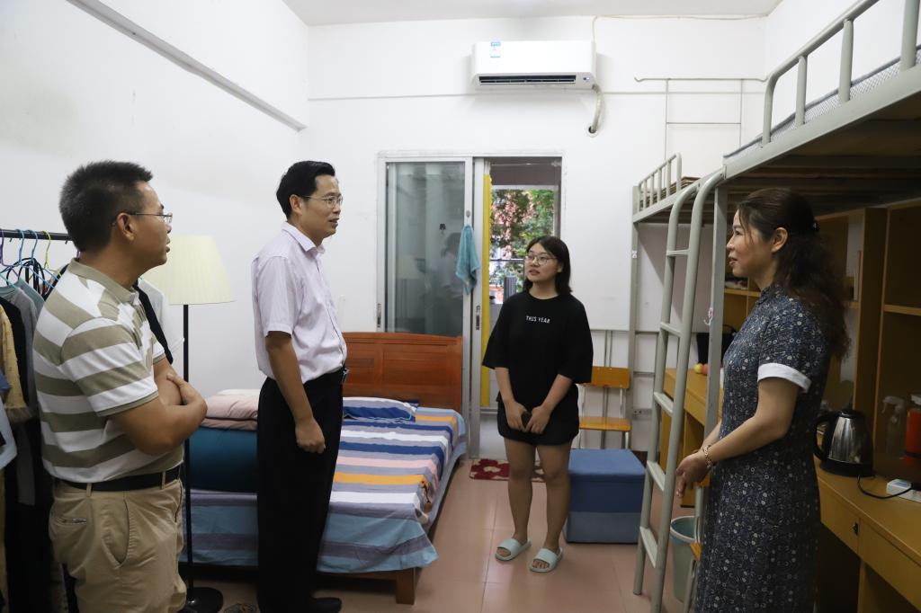 3日,罗书记巡视了整个校园。在会议室,罗书记同值班干部亲切交谈。今年国庆中秋假期,除常规安排的值班干部外,各学院也每天均有1名党政负责人在中山校区值班,为校园假期安全筑起牢固防线。罗书记代表学校党委对值班干部们放弃休息到校值班表示衷心感谢,特别为财务处副处长钟紫光同志带病值班点赞,并叮嘱他多保重身体。罗书记还专门带来了月饼、冬枣、蜜柚等水果点心,与值班人员分享。在学生宿舍,罗书记看望慰问了正在执勤的宿舍管理员,随后走访了多位新进思想政治辅导员,详细了解他们工作情况和住宿条件等。为进一步做好学生工作,今年新进辅导员全部入住学生宿舍,与学生打成一片。罗书记对辅导员们的吃苦耐劳精神表示肯定,勉励他们以“最美高校辅导员”陈小花等为榜样,在平凡的岗位上做出不平凡的业绩贡献。在第二食堂,罗书记仔细察看了一楼师生餐厅装修情况,要求项目负责人加快工程进度,确保在新生报到前开业,努力为师生提供更为舒适的用餐条件。罗书记还到人才公寓和中山园连廊等施工现场检查指导,强调坚持“质量第一、安全至上”,用心用情打造让领导放心、让师生满意的精品工程。罗书记动情地说:“人才公寓建好后,到中山校区任教、工作的教职工每人都可以分到带卫生间的房子,这真是值得高兴的事情”。