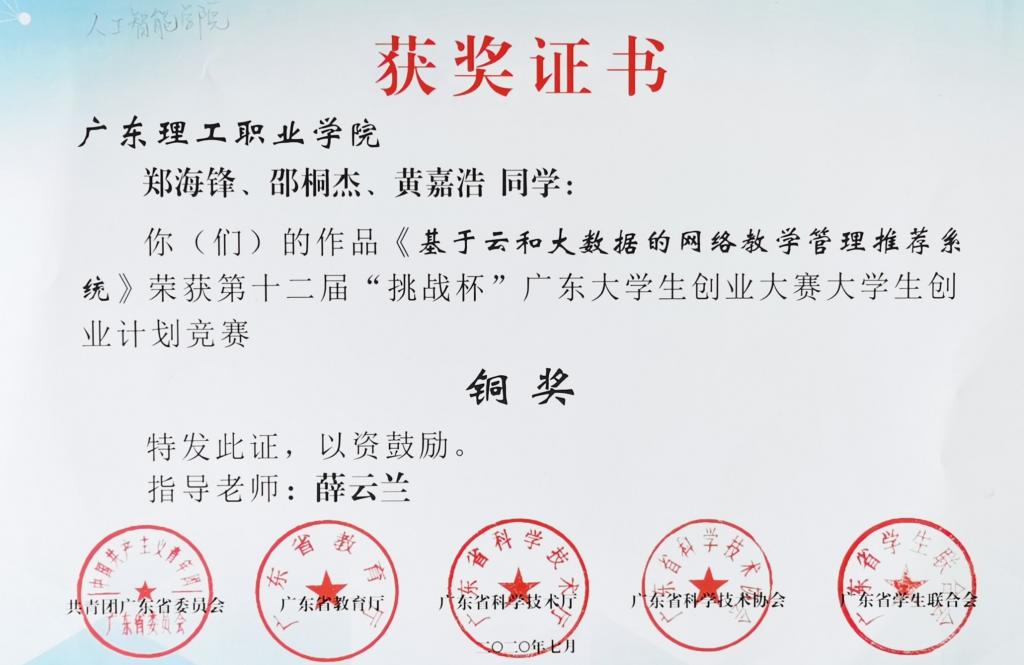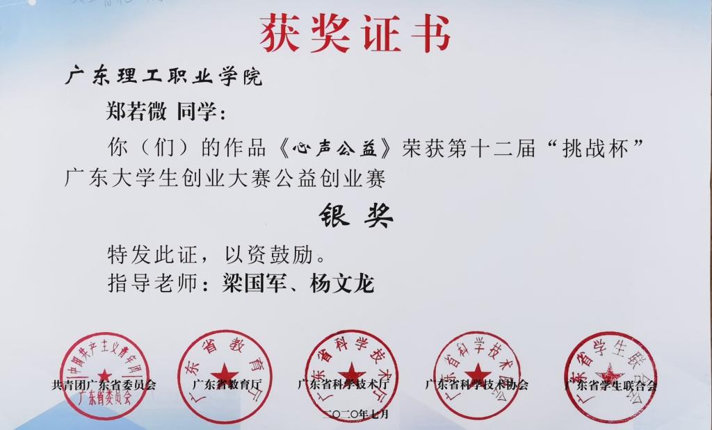 近日,从团省委、省教育厅获悉,由人工智能学院梁国军、杨文龙老师指导的作品《心声公益》在第十二届“挑战杯”广东大学生创业大赛公益创业赛中斩获银奖,由刘小飞、焦冬艳、李美满以及薛云兰等老师指导的2个作品分别取得大学生创业计划竞赛铜奖。