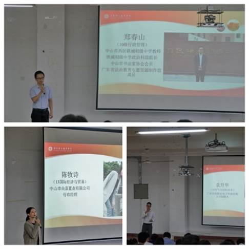 活动邀请了三名优秀校友分别从升学、就业、创业三个不同的方向作经验分享和交流。“为了插本,我卸载了微博,推掉了所有的聚会和娱乐活动。有时候你为了成功,就必须学会拒绝诱惑,懂得忍耐。”在分享交流环节中,现中山市西区铁城初级中学教师、2010级学生郑春山如此说道。在学校,他是书法协会会长,社团活动和学习生活都丰富精彩,大三时他凭着自己的毅力和奋斗,怀着一颗自信乐观的心,从学校大专毕业后成功插本到广州大学,又在广州大学继续深造取得硕士研究生学历,成为了师弟师妹们学习的榜样。2013级毕业生陈牧诗,现任中山市众嘉置业有限公司行政经理,她分享了毕业后面对高强度的工作,克服困难,坚守行业,作为一名女生也可以身兼多职、勇闯一片天地的故事。14级毕业生、广州市恒锂泰电子科技有限公司创始人袁开华则深情回顾了自己创业的艰辛历程,从创办小作坊起步,兢兢业业,成功赚取人生第一桶金。正处于事业不断稳步上升的大好时期,一场突如其来的火灾将之前所有的努力化为灰烬。袁开华校友又重新起步,坚持不懈,历经多次的起落,终于在专业路线的创业中取得一定的成绩。让师弟师妹深刻感受了什么是创业意识、创业勇气和创业精神。活动吸引了大量的同学提前到场,会场气氛踊跃而热烈!