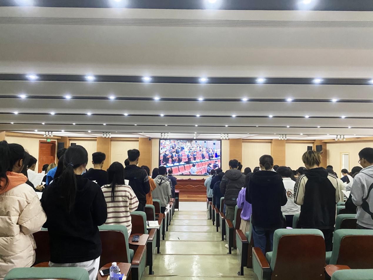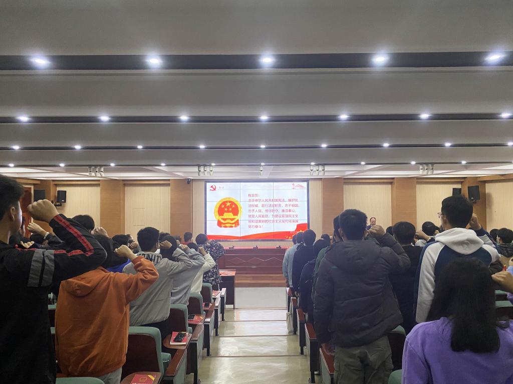 来自我校各专业的180余名师生代表在法律与行政学院院长王磊的带领下,进行了庄严的宪法宣誓。随后通过网络,和全国各地学校的青少年一起,跟着教育部负责人庄重地朗读《中华人民共和国宪法》。