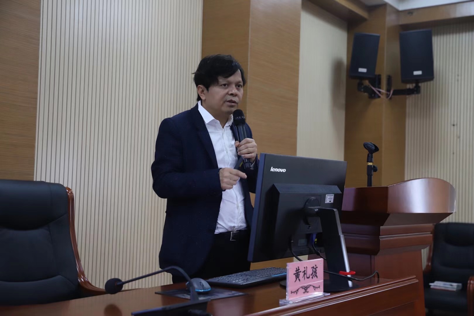 在学术报告厅,黄礼孩作“当代诗歌的阅读与写作”专题讲座。“诗歌是对散文与小说的分离”“诗是飞翔时的轻盈,非羽毛的轻”“玫瑰不是诗,玫瑰的香气才是诗”……黄礼孩列说了“诗歌是什么”的种种描述,引导师生理解把握诗歌的深刻内涵。他结合诗人的人生经历,分析鉴赏了风格各异的诗作名篇。“我的旗帜列成一队,相互没有纠缠……”黄礼孩请出嘉宾广州广播电视台新闻主播仲思和师生代表朗诵诗歌《风的君王》《一个词语》等,让师生们现场感受诗歌的美和深邃。如何创作诗歌?黄礼孩以同学写作的诗歌为例,手把手进行指导,从语言的写作、意象的使用、意境的提升等方面深入阐述了诗歌写作的方法和技巧。“当一个人拥有诗歌,他(她)就会变得精神强大、心灵自由,其人生就深沉而辽阔,就不再纠结于眼前的得失成败,就拥有自主学习、自我教育、自我提升的力量,他(她)就很难被打败。”黄礼孩真挚动情地娓娓道来。