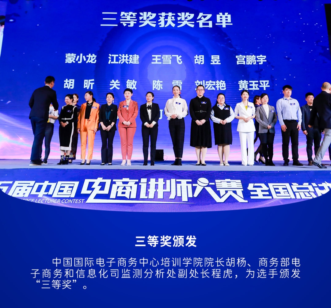 日前,第五届中国电商讲师大赛全国总决赛在莆田圆满落幕。应用外国语学院商务英语专业的王雪飞老师凭借跨境电商赛区二等奖的好成绩闯入决赛,与来自跨境电商、农村电商、生活电商和直播电商各大赛区的54名选手同台竞艺。王雪飞老师在与来自全国各地电商行业高手的比赛中,不畏强手,发挥出色,以稳健的台风、独特的叙事,展现了高职跨境电商教师的风采,荣获三等奖(跨境电商第1名,总排名第13位)。