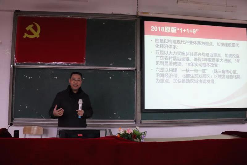 陈副校长传达了相关文件精神,介绍了本次专题学习的背景情况,并就学习宣传贯彻习近平总书记出席深圳经济特区建立40周年庆祝大会和视察广东重要讲话重要指示精神以及十九届五中全会精神,为师生党员作专题辅导。陈副校长着重围绕“两个大局”、“新发展格局”、广东在新发展阶段的“总定位总目标” 等方面进行深入细致的讲解,并结合2018年广东省委“1+1+9”工作部署与2020年广东省委“1+1+9”工作部署的主要内容进行深入分析对比和详细解读。