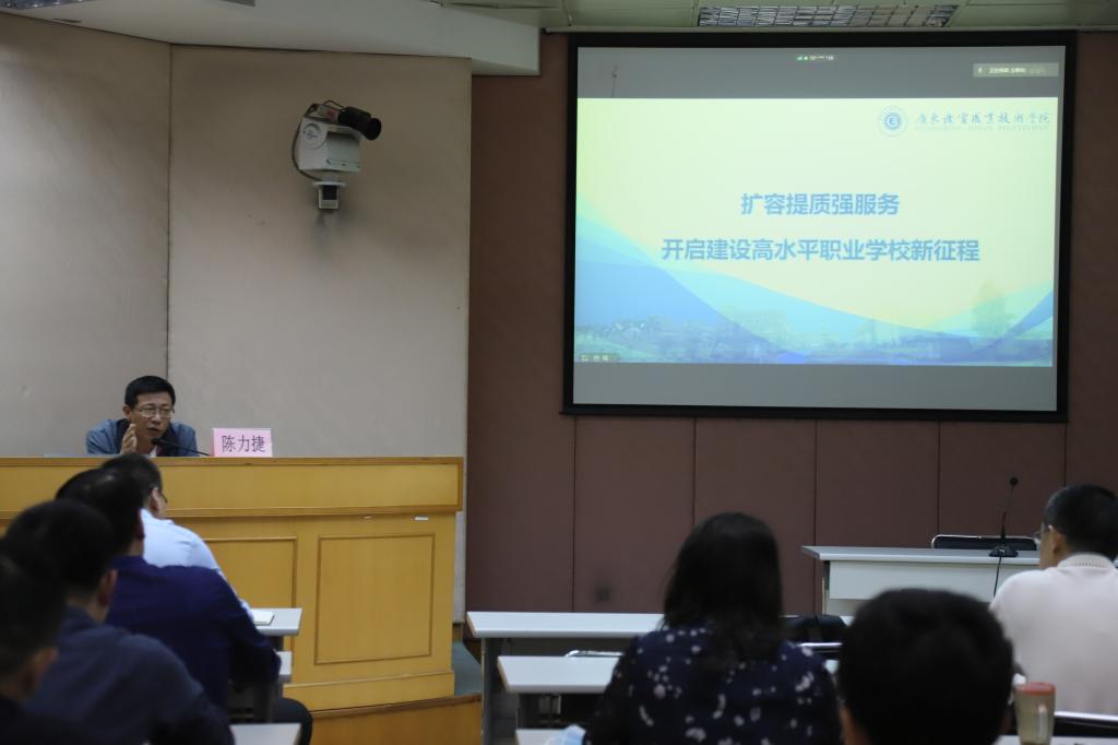 广东机电职业技术学院副校长、二级教授陈力捷受邀来校作题为《扩容提质强服务——开启建设高水平职业学院新征程》专题报告。陈教授从“创新强校工程”与高等教育扩容提质强服务的背景关系,对高校双高引领、提质培优的意义,学校建设发展的目标分解与项目申报的对应关系以及项目过程监管、考核的目标细化和资金分配等四个方面作了分享介绍。陈教授谈经验、授方法,实效实用,令参会者受益匪浅。