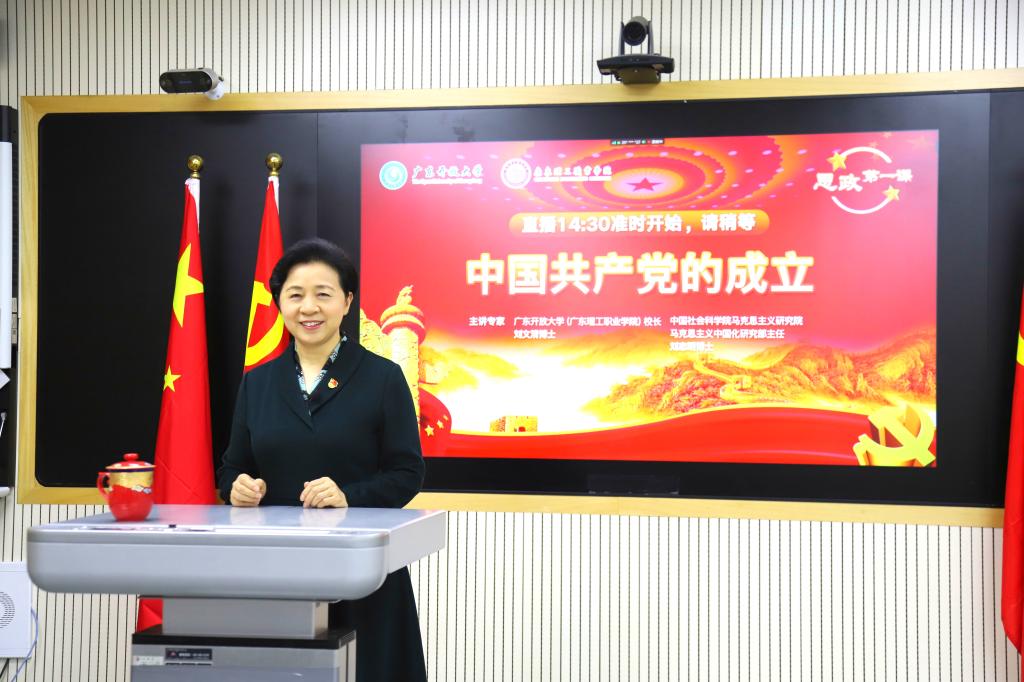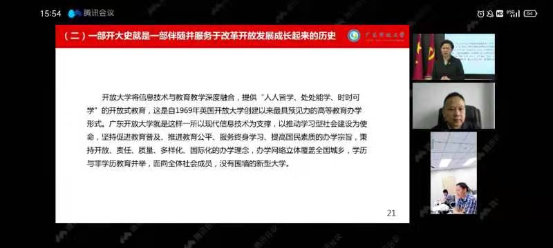 百年征程波澜壮阔,百年初心历久弥坚。为扎实推动党史学习教育进校园,4月1日,广东开放大学校长刘文清,中央马克思主义理论研究和建设工程专家、中国社会科学院教授刘志明,与广东开放大学体系5万多名师生相聚云端,同上一堂党史课暨“思政第一课”,勉励广大干部师生学好党史这门必修课,树立正确党史观,从百年光辉历程中汲取前进智慧和力量,以昂扬姿态奋力开启学校“十四五”发展新征程,为广东在全面建设社会主义现代化国家新征程中走在全国前列、创造新的辉煌作出新的贡献。