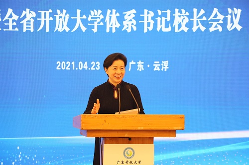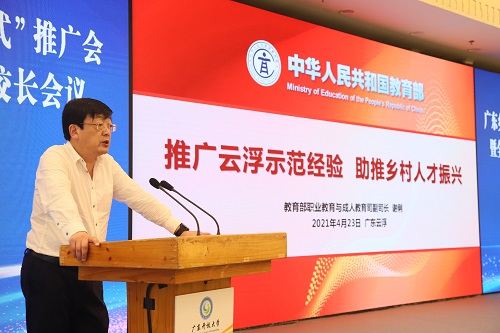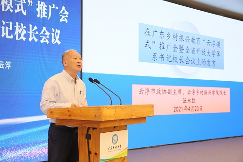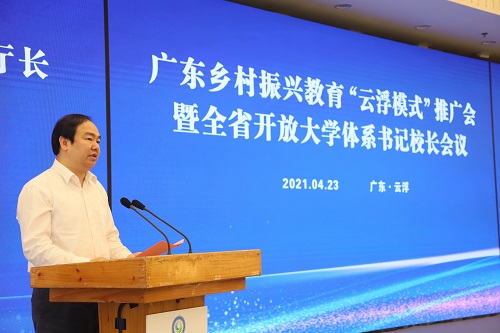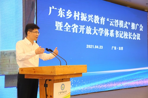 4月23日,广东乡村振兴教育“云浮模式”推广会暨全省开放大学体系书记校长会议在云浮市迎宾馆召开,会议由广东省教育厅、云浮市人民政府指导,广东开放大学主办,云浮乡村振兴学院、云浮开放大学承办。教育部职业教育与成人教育司副司长谢俐,省委教育工委副书记、省教育厅党组副书记李大胜,省农业农村厅党组成员、副厅长陈东,广东开放大学校长刘文清,云浮市人民政府市长王胜,云浮市政协副主席、云浮乡村振兴学院院长伍永胜等出席会议并讲话,出席会议的还有云浮市人民政府副市长钟汉谋、徐树新和广东开放大学副校长瞿志印、孙平、王宜奋、宋波以及教育部、省教育厅和省农业农村厅有关处室的同志等。省委常委叶贞琴同志十分关心本次会议,在会议筹备期间给予了支持、指导,并特别委托陈东同志出席会议,转达他对乡村振兴教育“云浮模式”的肯定和对推广会的期待。