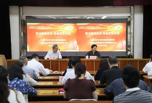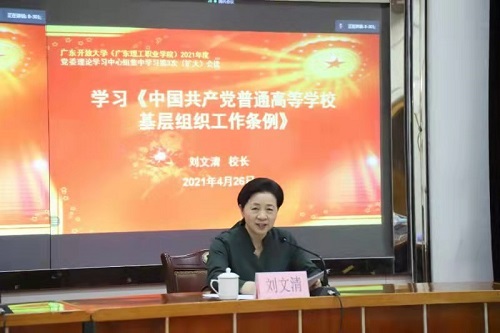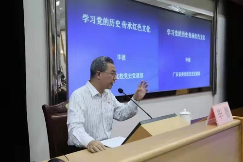 历史是最好的老师。4月26日下午,学校举行党史学习教育宣讲会暨党委理论学习中心组第3次(扩大)学习会,传达学习《中国共产党普通高等学校基层组织工作条例》(以下简称《条例》),邀请党史学习教育省委宣讲团成员、中共广东省委党校教授毕德作党史学习教育宣讲。学校校长、党史学习教育领导小组组长刘文清主持会议。全体校领导、党史学习教育领导小组及办公室成员、党委中心组成员、全体中层干部、各基层党组织书记、民主党派支部(支社)委员、正高职称人员、党务部门及马克思主义学院干部教师共140余人参加学习。