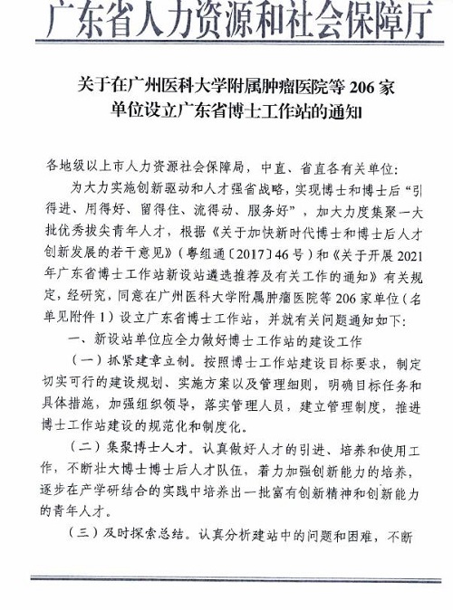 广东省人力资源和社会保障厅印发《关于在广州医科大学附属肿瘤医院等206家单位设立广东省博士工作站的通知》,我校获批设立广东省博士工作站。