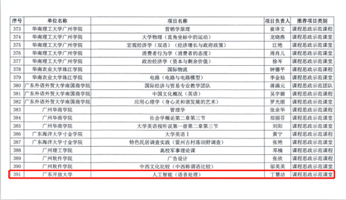 广东省教育厅公布2020年度课程思政建设改革示范项目认定结果,学校人工智能学院副院长丁慧洁副教授负责的“人工智能(语音处理)”项目通过省课程思政示范课堂认定,这是学校课程思政改革的突破。