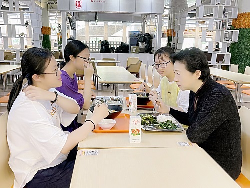 最后,刘文清来到师生食堂和学生共进午餐,听取他们对学校发展的意见建议。同学们激动地汇报了收听收看刘校长新学期“思政第一课”的学习心得体会,并表示,近年来,特别是党史学习教育开展以来,学校为学生办了大量实事好事,比如深化新时代教育评价改革、建设一站式服务大厅、完善校园周边交通条件,深切感受到学校对青年学生的关心关怀。刘校长指出,当代中国青年是与新时代同向同行、共同前进的一代,生逢盛世,肩负重任,勉励他们牢记习近平总书记嘱托,肩负历史使命,坚定前进信心,立大志、明大德、成大才、担大任,努力成为堪当民族复兴重任的时代新人,让青春在为祖国、为民族、为人民、为人类的不懈奋斗中绽放绚丽之花。