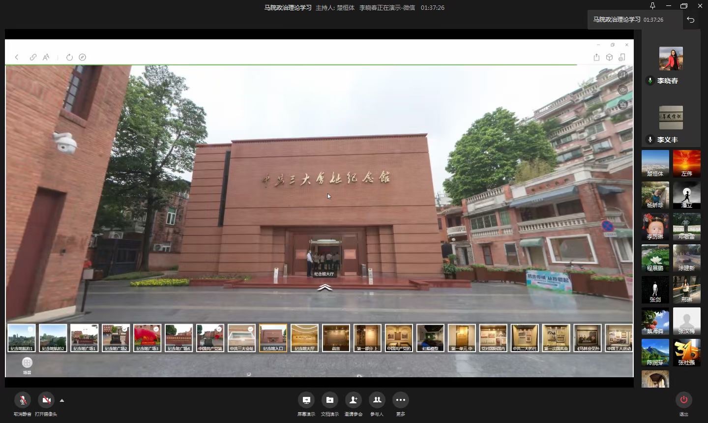 在疫情防控期间,马院党支部首次引入云端参观中共三大会址纪念馆的方式,重温入党誓词,利用虚拟仿真技术,进行了一次特殊的党史学习教育。云端走进中共三大会址广场,在李义丰书记的领誓下,全体党员紧握右拳,铿锵有力的宣誓声中,再一次铭记自己作为党员的初心与使命。接着支部副书记李晓春老师作为云导游,带领党员们一同走进中共三大会址纪念馆。1923年6月12日至6月20日,中国共产党第三次全国代表大会在广州召开,纪念馆内开设了“上下求索”“凝聚共识”“风起云涌”“理想之光”等四个展出单元,生动展现了这次大会的历史背景、召开过程、重大成果与深远影响。李晓春老师一边解说一边展示照片、图表、油画、文物、雕塑、立体场景、全息影像等,与党员老师们展开互动式、沉浸式的学习教育。