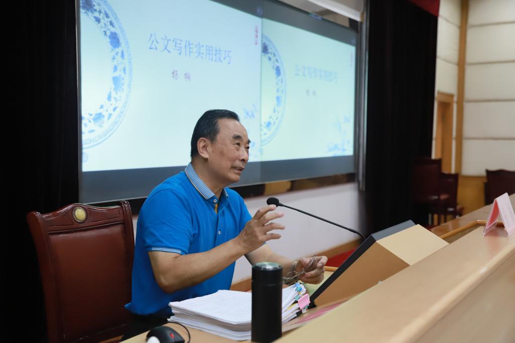 结合“我为群众办实事”实践活动,为提升学校公文写作与新闻报道水平,加强语言文字工作,7月9日下午,学校通过“线上+线下”方式,举办公文写作与新闻报道培训会,邀请广东省秘书学会会长、省委原副秘书长、博士生导师杨桐教授作专题辅导讲座。