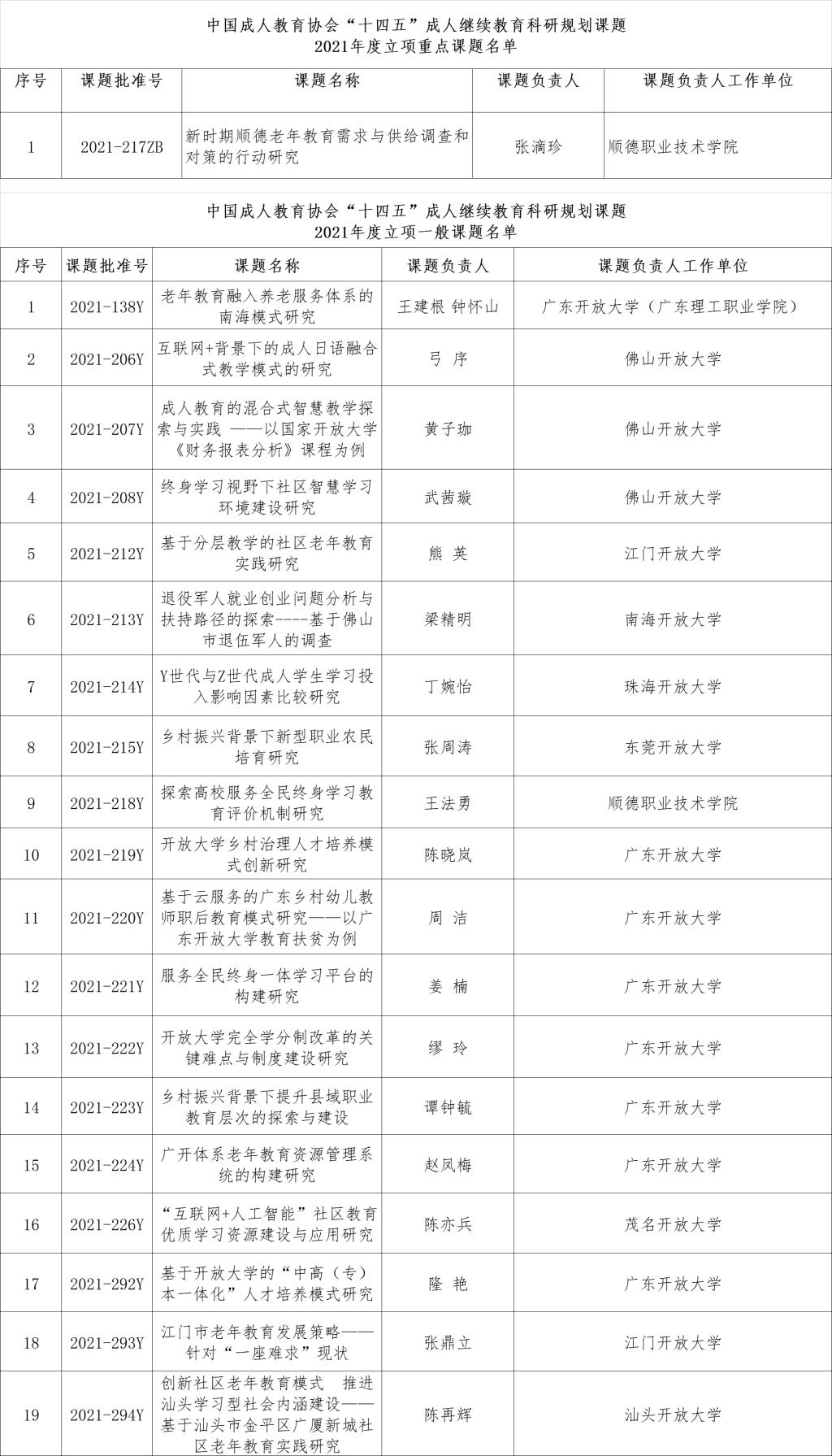 顺德开放大学(顺德职业技术学院)张滴珍老师主持的《新时期顺德老年教育需求与供给调查和对策的行动研究》获立重点课题,我校王建根老师主持的《老年教育融入养老服务体系的南海模式研究》、佛山开放大学弓序老师主持的《互联网+背景下的成人日语融合式教学模式的研究》等19项课题获立中国成人教育协会“十四五”成人教育科研规划2021年度一般课题。
