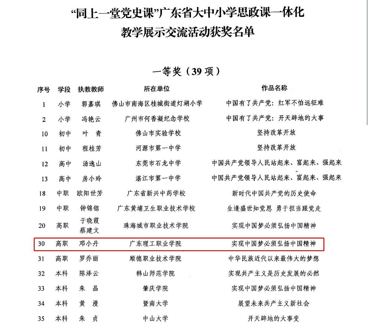为推动党史走进校园、融入思政课程,推进大中小学思政课一体化教学改革创新,今年5月,广东省教育厅举办了“同上一堂党史课”广东省大中小学思政课一体化教学交流展示活动,要求各学段参赛教师根据指定教学内容进行1课时录制。我校马克思主义学院邓小丹老师以毛泽东思想和中国特色社会主义理论体系概论中的《实现中国梦必须弘扬中国精神》为题,作了精心的教学准备和课程录制。经学校初赛、复赛并推荐报送至省教育厅,最终斩获得一等奖。
