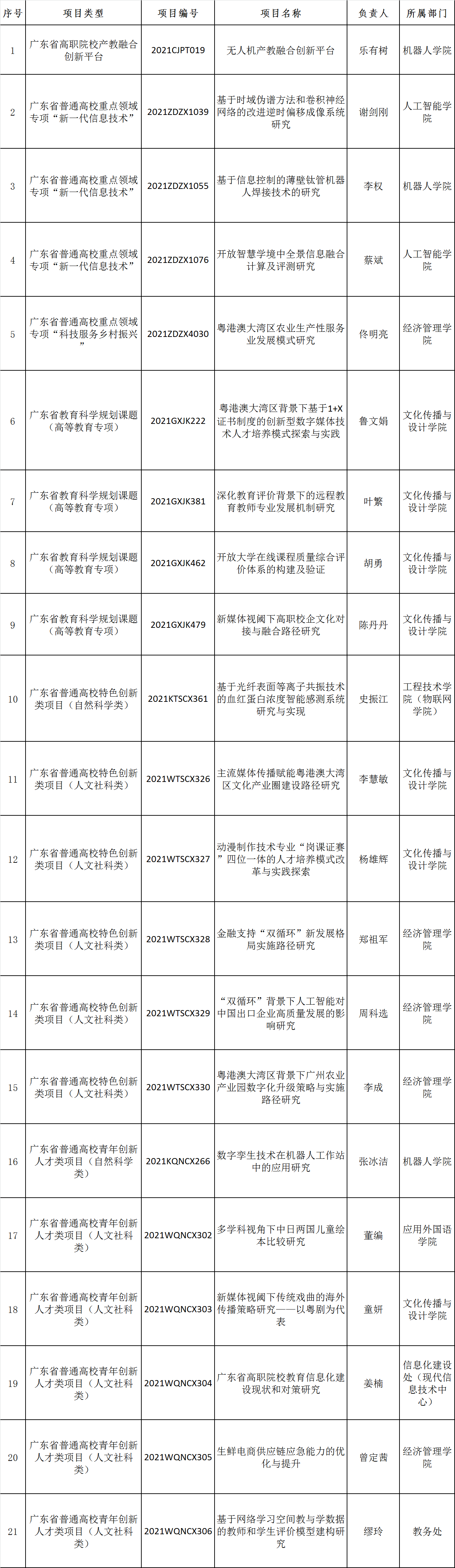 近日,广东省教育厅公布了《广东省教育厅关于公布2021年度普通高校认定类科研项目立项名单的通知》(粤教科函〔2021〕7号)、《广东省教育厅关于公布2021年度普通高校重点科研平台和项目立项名单的通知》(粤教科函〔2021〕8号)和《广东省教育科学规划领导小组办公室关于公布2021年度教育科学规划课题(高等教育专项)立项名单的通知》,我校共有21个项目获得立项。其中,创新平台获批1项;重点领域专项获批4项;教育科学规划课题获批4项;认定类项目获批12项。