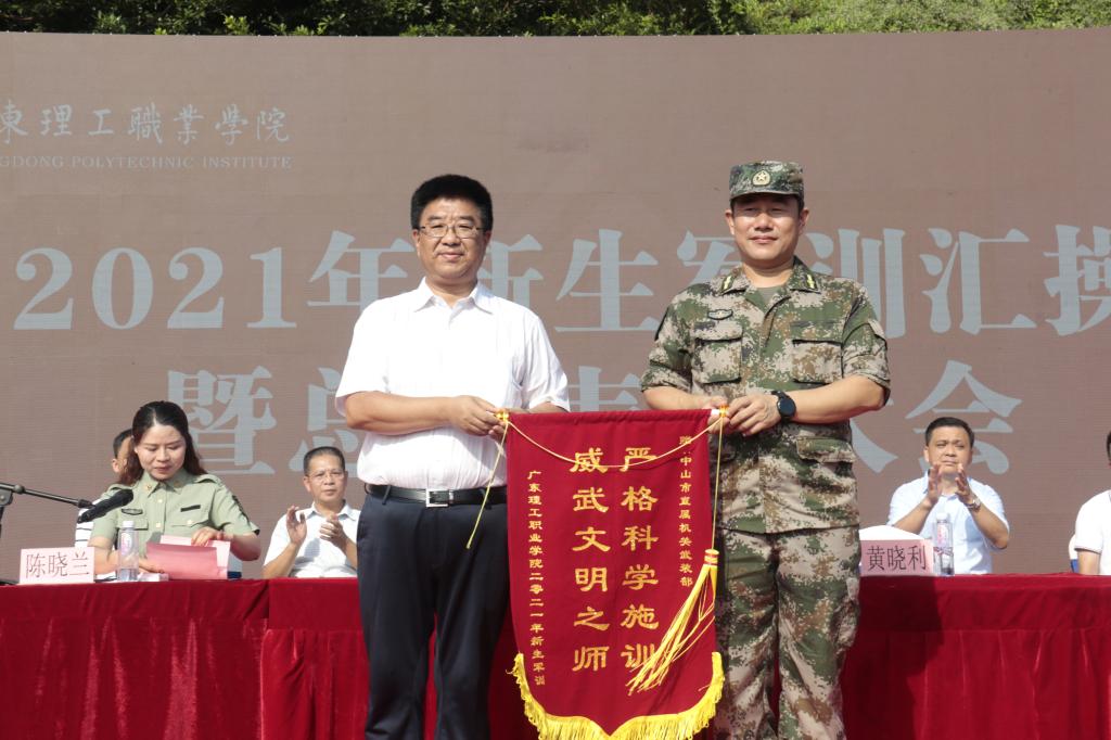 军训的显著成效,得益于教官的科学施训和承训部队领导的高度重视。学校宋波副校长向中山市直属机关武装部黄晓利部长赠送锦旗。