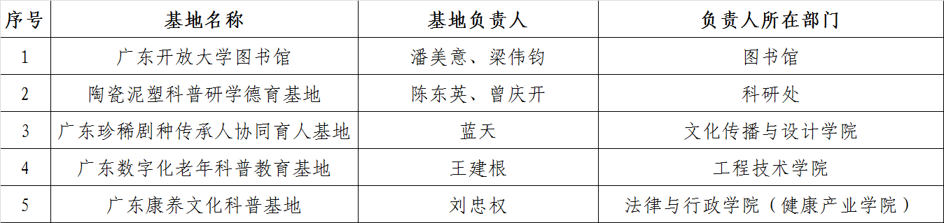 根据《关于认定广东省人文社会科学普及基地的通知》(粤社科联通〔2021〕31号),我校申报的“广东开放大学图书馆”“陶瓷泥塑科普研学德育基地”“广东珍稀剧种传承人协同育人基地”“广东数字化老年科普教育基地”和“广东康养文化科普基地”等5项基地成功获得省社科联的立项。这是我校首次获批广东省人文社会科学普及基地。