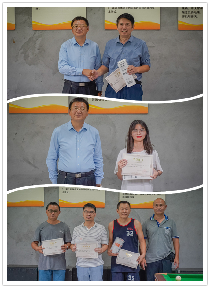 本次比赛共有13位老师和41位学生参加了本次比赛,共有13位裁判员同学裁定了本次比赛。比赛分为英式斯诺克、男子中式九球和女子中式九球三个赛项,每个赛项分别进行淘汰赛、循环赛和决赛环节。最后,胡运江老师夺得男子中式九球赛项冠军,机电工程学院20级的石红宇同学夺得女子中式九球赛项冠军,机电工程学院19级的魏育辉同学夺得英式斯诺克赛项冠军。本次比赛共产生一等奖3名、二等奖9名、三等奖16名,孙平副校长出席颁奖典礼,并为获奖选手颁发了获奖证书和奖品。