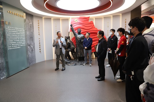 中山市红色资源丰富,每一寸红色热土,每一段红色故事,都是弥足珍贵的精神财富。怀着对革命先辈敢为人先、善于创造、乐于奉献的无限景仰之情,同学们在刘启宇带领下来到今年新落成的市党建展览馆参观,实地拓展学习,感悟初心使命。展览馆设置杨殷厅、珠江纵队厅、“四最”按语厅、里溪厅、不走回头路厅、美丽中山厅、新时代先锋厅、警示教育厅、初心使命厅等9个展厅,以党的领导和党的建设为主线,精选图文、视频、实物等珍贵历史素材,辅以声、光、电等先进技术手段,生动展示党组织在中山的百年奋斗历程,以及中山人民在党的领导下创造的经济社会发展成就。刘启宇结合展厅内容讲解,旁征博引、史论结合,让同学们充分领略中国共产党紧紧团结和依靠人民,战胜无数艰难险阻,夺取革命、建设、改革一个又一个伟大胜利,实现中华民族从站起来、富起来到强起来的伟大飞跃的壮阔征程。