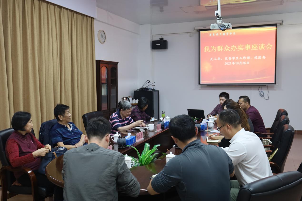 近日,由学校关工委主任、原校长杨炳生带队,原副校长余嘉强和王苏莉、杨雪兰两位老处长一行4人到中山校区开展“我为群众办实事”专题座谈,党委学生工作部部长陈晓兰和校团委书记温艳艳陪同座谈,学工部、团委有关人员也参加了座谈。
