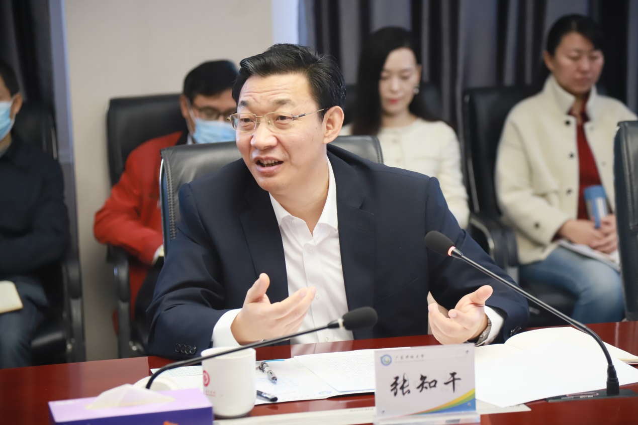 张知干指出,广东开放大学在新时代取得前所未有的大发展,一年一个新台阶,年年都有标志性新进步,生动演绎了我国开放教育迈向高质量发展之路的精彩画卷,学校社科事业也乘势而上走在了更加明媚的春天里,完全有能力有条件建设好、运行好研究基地,并通过发挥其种子选手的作用,辐射带动学校社科事业整体迈入全省第一方阵。一是要始终坚持正确的政治方向和学术导向。要旗帜鲜明地坚持以习近平新时代中国特色社会主义思想为指导,并将其统领贯穿于社科事业发展全过程各方面。要在学深悟透习近平新时代中国特色社会主义思想上下更大功夫,全面提高政治判断力、政治领悟力、政治执行力,并将其转化为清醒的理论自觉、坚定的理想信念、科学的思维方法,真正立时代之潮头、通古今之变化、发思想之先声,努力成为先进思想的倡导者、学术研究的开拓者、社会风尚的引领者、党执政的坚定支持者。二是要牢固坚持和强化创新的核心地位。要从战略和全局的高度,从不折不扣落实国策的高度,从践行马克思主义世界观、方法论的高度,深刻认识推进改革创新是社科事业高质量发展的必由之路和必然途径。要大胆对人文社会科学的研究路径、方法、形式进行变革,在破立并举、大破大立中推进战略性系统性整体性创新,努力在寻求大突破中培育发展新动能、厚植发展新优势、抢占发展制高点。三是要充分发挥研究基地的聚合引领作用。要矢志不渝沿着习近平总书记指引的方向和教给的方法,紧紧围绕党和国家工作大局和全省经济社会发展全局,坚定不移以研究和解决中国发展特别是大湾区建设发展的重大理论和现实问题为主攻方向,积极推动基础理论研究与应用对策研究融合发展,多出决策咨询报告,多出原创性研究成果,多提标识性概念,奋力抢占相关领域的学术话语权,不断为繁荣中国学术、发展中国理论贡献广东智慧、作出广东努力,努力为推动粤港澳大湾区高质量发展提供理论支持、智力支撑和实践支援。