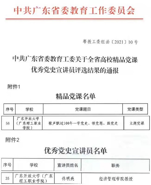 近日,中共广东省委教育工委公布了全省高校精品党课优秀党史宣讲员评选结果,全省高校共评选出100门精品党课,60名优秀党史宣讲员。我校党委报送的主题党课《歌声飘过100年—学党史、颂党恩、跟党走》(主讲人:经济管理学院教授佟明亮)被评为全省高校精品党课,佟明亮荣获全省高校优秀党史宣讲员称号。