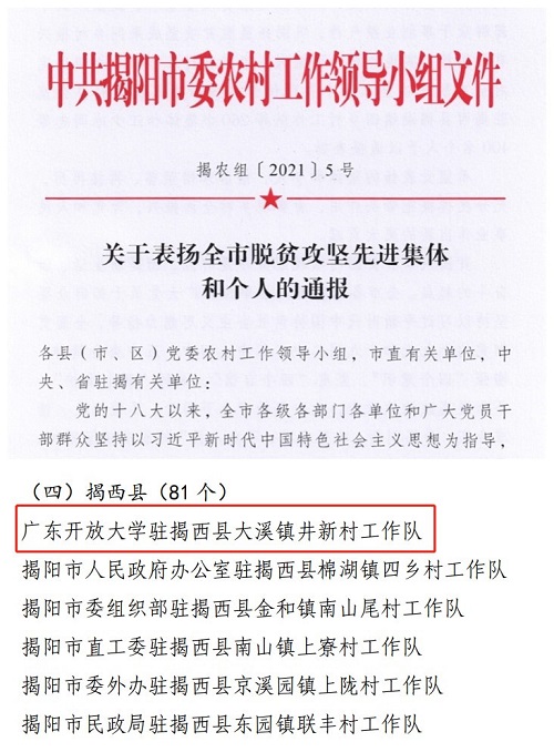 在脱贫攻坚战取得全面胜利的历史性时刻,中共揭阳市委农村工作领导小组印发《关于表彰全市脱贫攻坚先进集体和个人的通报》(揭农组〔2021〕5号),广东开放大学驻揭西县大溪镇井新村工作队获评揭阳市脱贫攻坚先进集体。