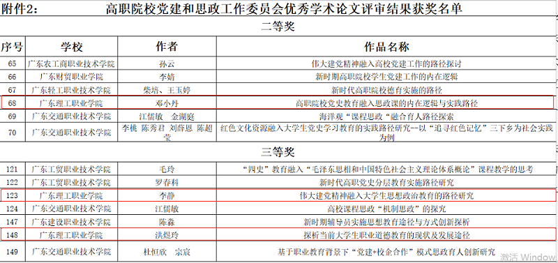机电工程学院(标准化学院)党总支的党建工作案例《劳模工匠精神融入党建育人模式探索》(作者:李静)获优秀典型案例一等奖,人工智能学院党总支的党建工作案例《以赛促学,以赛促建,发挥党员师生职业技能竞赛先锋作用》(作者:陈吉生)获优秀典型案例三等奖;马克思主义学院邓小丹的《高职院校党史教育融入思政课的内在逻辑与实践路径》获优秀学术论文二等奖,机电工程学院(标准化学院)李静的《伟大建党精神融入大学生思想政治教育的路径研究》、洪煜玲的《探析当前大学生职业道德教育的现状及发展途径》均获优秀学术论文三等奖。