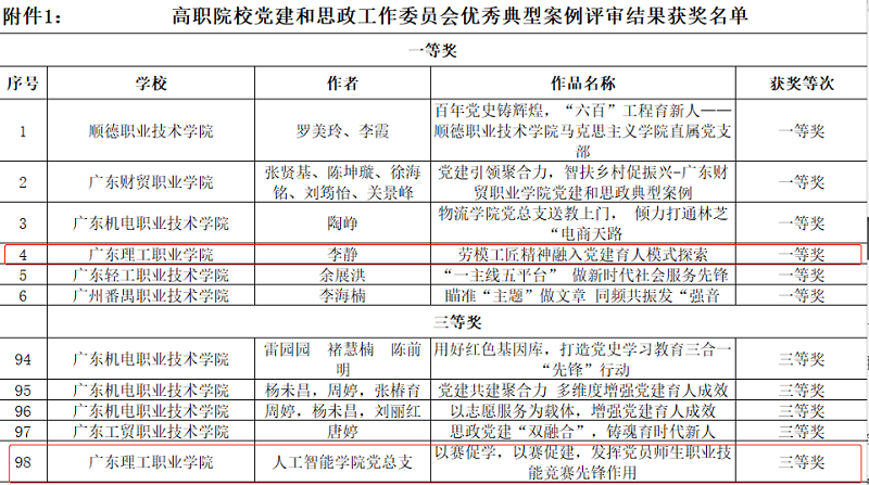 近日,我校多个基层党组织和多名教职工党员的多项党建成果在广东省高职院校党建和思想政治工作委员会组织的优秀典型案例和学术论文征集评选活动中获表彰。