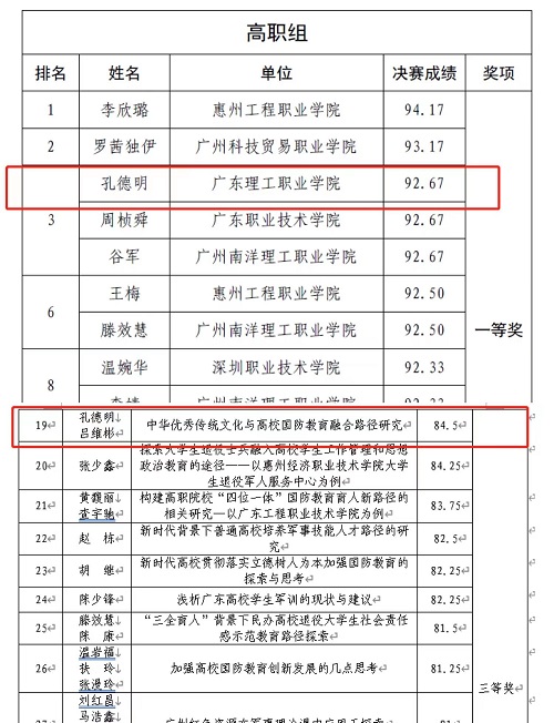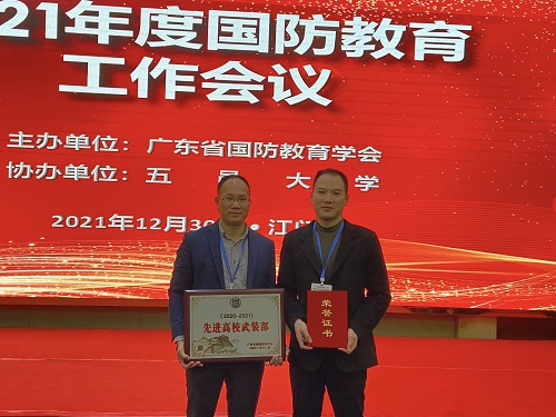 12月29-31日,2021年度广东省国防教育工作会议在江门召开。学校党委武装部获评“2020-2021年度先进高校武装部”;党委学生工作部(武装部)祝鹏获评“2020-2021年度国防教育工作先进个人”;孔德明荣获“2021年广东省普通高等学校军事理论课教学比赛高职组一等奖”,其撰写的论文《中华优秀传统文化与高校国防教育融合路径研究》获评“2021年国防教育优秀论文三等奖”。