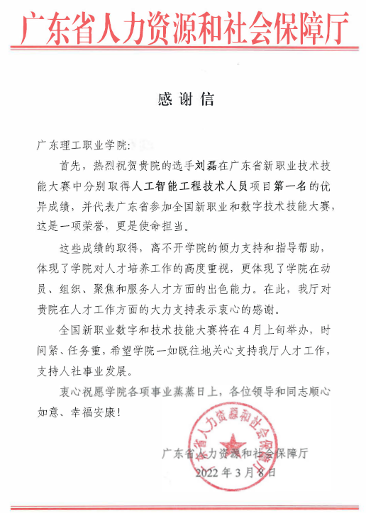 感谢信说,广东理工职业学院选手刘磊在省新职业技术技能大赛中取得人工智能工程技术人员项目笫一名的优异成绩并将代表省参加全国新职业和数字技术技能大赛,对此表示热烈祝贺。感谢信表示,上述成绩的取得,离不开学校的倾力支持和指导帮助,体现了学校对人才培养工作的高度重视,更体现了学校在动员、组织、聚焦和服务人才方面的出色能力,对学校在人才工作方面的大力支持表示衷心感谢。