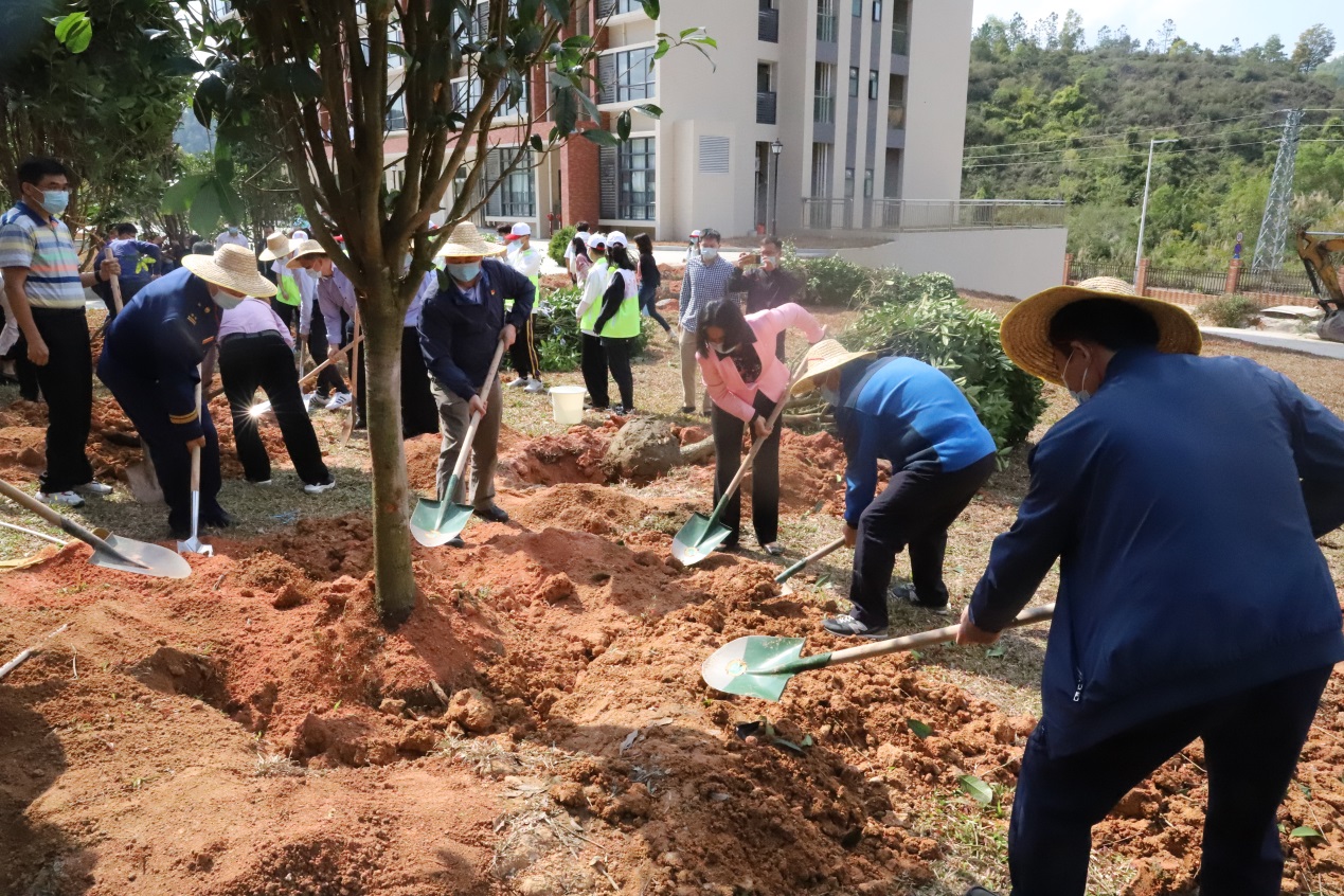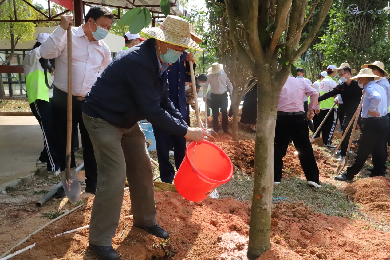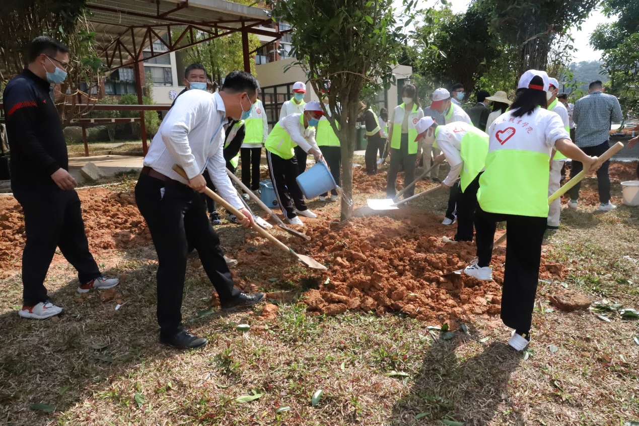 干部师生分工协作,挥锹铲土、扶树填坑、拎桶浇水。一番劳作后,一株株树苗迎风而立,生意盎然,为初春的校园增添了一抹新绿。