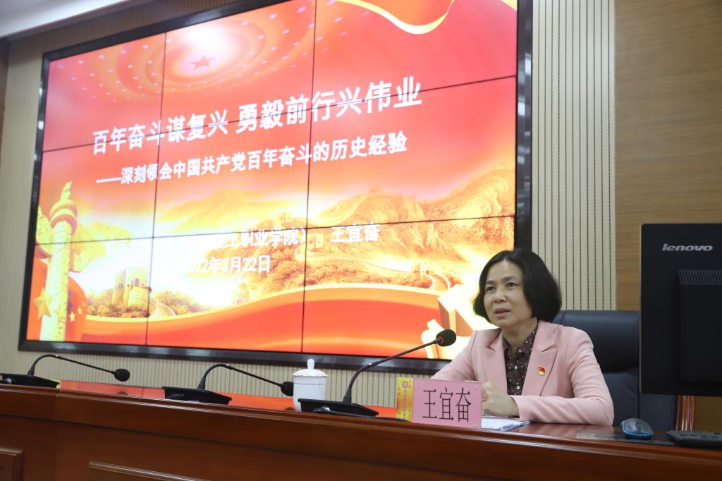 3月22日下午,学校副校长王宜奋在中山校区学术报告厅以“百年奋斗谋复兴 勇毅前行兴伟业——深刻领会中国共产党百年奋斗的历史经验”为题,给应用外国语学院学生主讲新学期“思政第一课”。