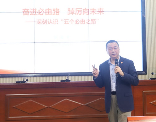讲授过程中,刘启宇引用“窑洞对”、中国女排精神、“三千孤儿入内蒙”等生动故事,对“五个必由之路”的丰富内涵做了深入浅出的解读。他表示,习近平总书记在参加十三届全国人大五次会议内蒙古代表团审议时,回顾新时代党和人民奋进历程,提出了“五个必由之路”重大论断。“五个必由之路”构成一个有机整体,系统回答了新时代谁来领导、走什么路、具备什么样的状态、如何持续发展、怎样锻造坚强领导等一系列重要问题,深刻揭示了中国答卷背后的成功密码。“五个必由之路”重大论断是我们党不断推进理论创新的最新成果,是习近平新时代中国特色社会主义思想与时俱进的丰富发展,进一步深化了对共产党执政规律、社会主义建设规律、人类社会发展规律的认识,具有很强的思想性、理论性、现实性、指导性。