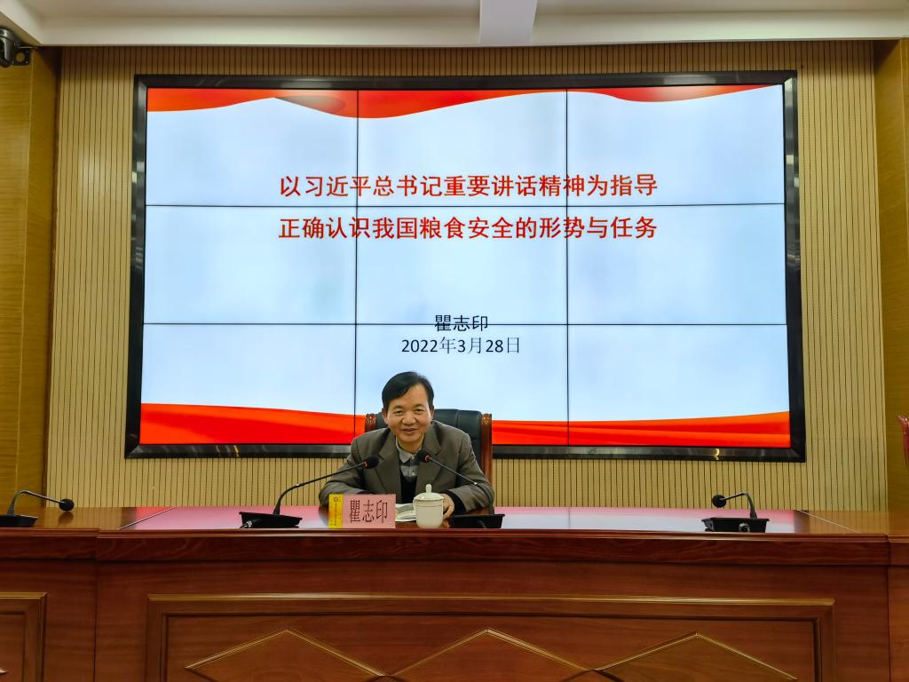 3月28日下午,学校副校长瞿志印在中山校区学术报告厅以“以习近平总书记重要讲话精神为指导,正确认识我国粮食安全的形势与任务”为题,给经济管理学院学生讲授“思政第一课”。