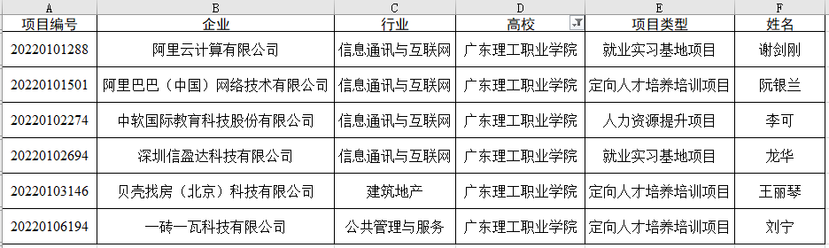 学校入选的6个项目涵盖定向人才培养培训、就业实习基地和人力资源提升等类型,合作用人单位包括阿里云计算有限公司、阿里巴巴(中国)网络技术有限公司、中软国际教育科技股份有限公司、深圳信盈达科技有限公司、贝壳找房(北京)科技有限公司和一砖一瓦科技有限公司等,涉及信息通讯与互联网、建筑地产和公共管理与服务等行业。