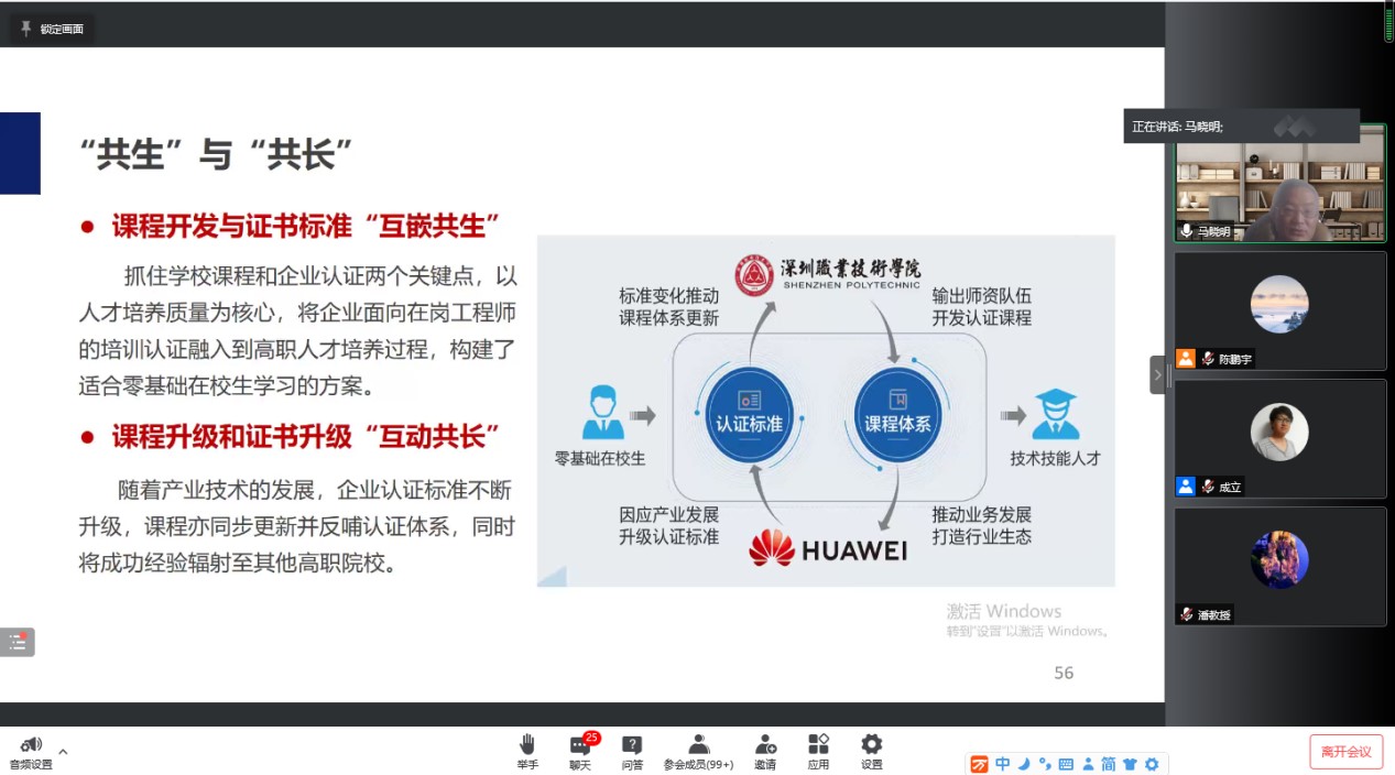 国家级教学成果奖是按照《教学成果奖励条例》设立、特等奖由国务院批准的教育教学研究和实践领域最高奖,每四年评审一次。马晓明结合他主持建设完成并获得2018年国家级教学成果奖特等奖的《深职院—华为培养信息通信技术技能人才“课证共生共长模式”研制与实践》项目实例,精彩分享了教学成果培育与申报宝贵经验,包括要服务国家战略,要抓住产教深度融合、适应地方经济社会发展与人才培养热点,要突出问题导向、项目依托、特色突出、协同培育、成果实践、成效推广与全面总结沉淀关键等。