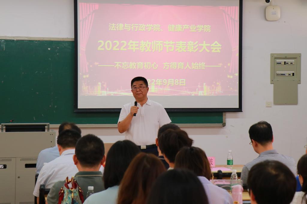 为热烈庆祝第38个教师节,弘扬师德师风,9月8日,法律与行政学院、健康产业学院召开2022年教师节表彰大会。学校副校长宋波出席大会,学院全体教职工、学生代表参加。
