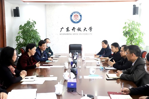 刘文清代表学校对李松一行的到来表示热烈欢迎,并简要介绍了学校办学情况及老年学学科、学分银行等方面的优势特色,希望聚焦双方优势,搭建合作平台,在人才培养、养老服务、科技成果转化等领域开展深度合作,实现互利共赢,更好赋能广东高质量发展。