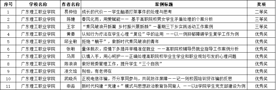 近日,由高校思想政治工作队伍培训研修中心(华南师范大学)、广东省高等学校思想政治教育研究会组织开展的广东高校学生工作案例评优活动评选结果揭晓,学校喜获二等奖1项、三等奖2项、优秀奖8项。