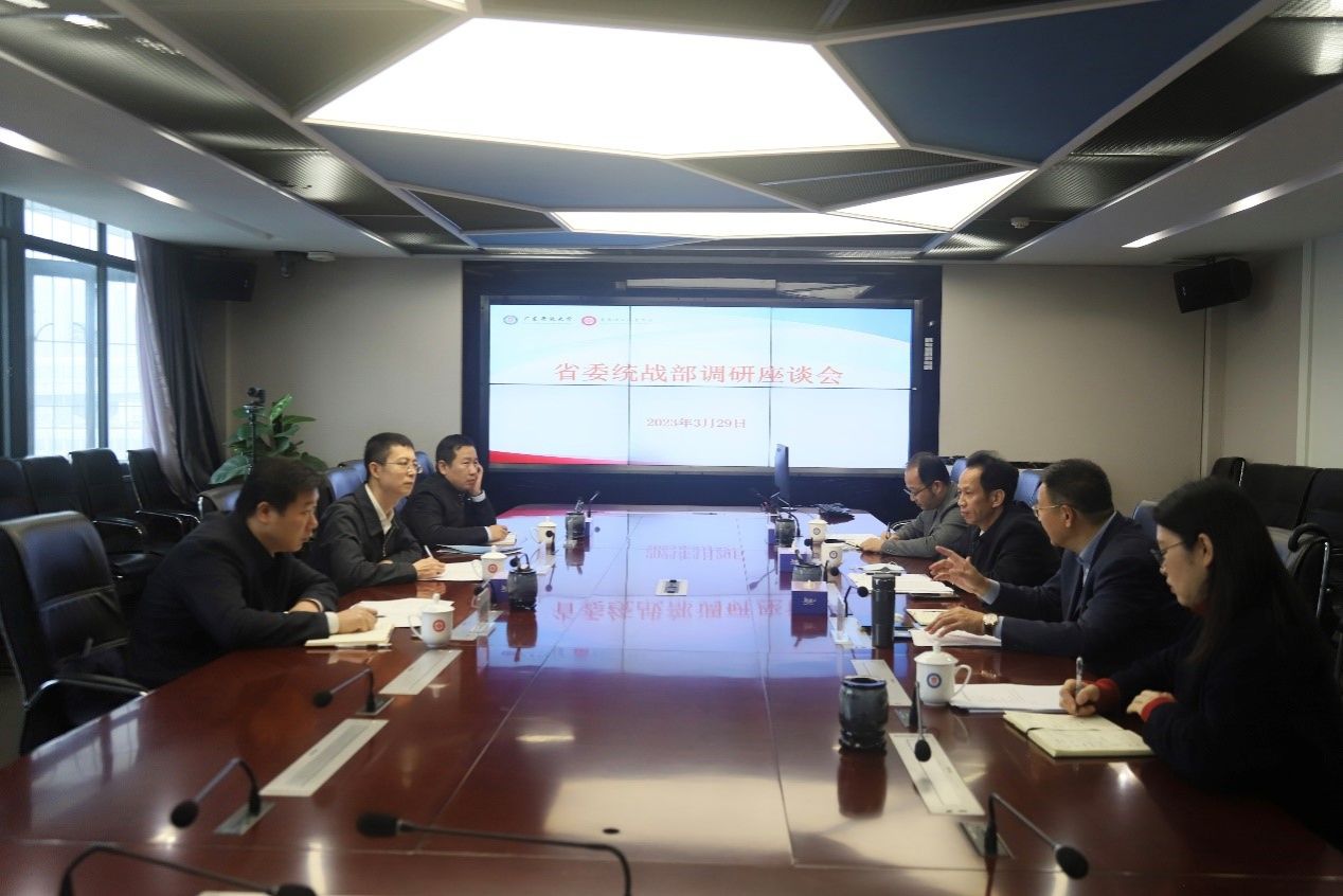 3月29日上午,省委统战部知工处副处长(主持工作)刘帅来校调研指导统战工作。学校党委副书记谢锦群出席会议,副校长孙平出席并主持会议。省委统战部知工处副处长何传普、主任科员董栋随同调研。