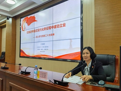 王宜奋带领同学们认真学习了党的二十大报告,详细介绍了中国式现代化的中国特色和本质要求、前进道路上必须牢牢把握的重大原则,指出党的二十大明确了新时代新征程中国共产党的使命任务,对全面建成社会主义现代化强国两步走战略安排进行了宏观展望,重点部署了未来5年的战略任务和重大举措,要求大家要学思践悟,切实把思想行动统一到党的二十大精神上来。