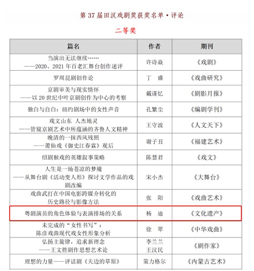 近日,全国戏剧期刊联盟与田汉戏剧奖组委会发布第37届田汉戏剧奖评选结果,其中学校文传学院副教授、博士杨迪的作品《粤剧演员的角色体验与表演排场的关系》获评论类二等奖,这是学校首次获得该类奖项。