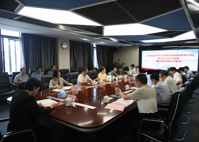 9月8日上午,学校举行省域高水平高职院校(以下简称“双高”)建设情况汇报会暨“双高”建设责任书签订仪式,听取“双高”建设阶段性进展情况汇报,立下高质量完成各项建设任务“军令状”,就做好下一步建设工作进行再动员、再部署。学校党委副书记、校长、“双高”建设工作领导小组组长刘文清出席会议并讲话。学校副校长、“双高”建设工作领导小组副组长王宜奋主持会议。学校“双高”建设工作领导小组全体成员,以及各建设任务和建设项目负责人参加会议。