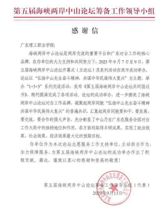 感谢信说,学校作为第五届海峡两岸中山论坛志愿服务支持单位,主动担当作为,全力保障服务,为论坛的成功举办作出了积极贡献。