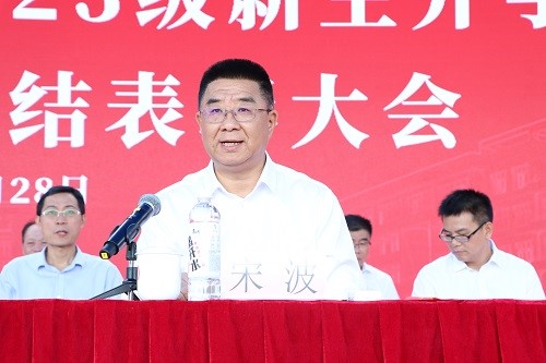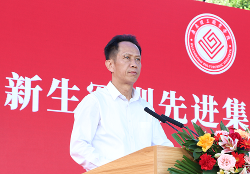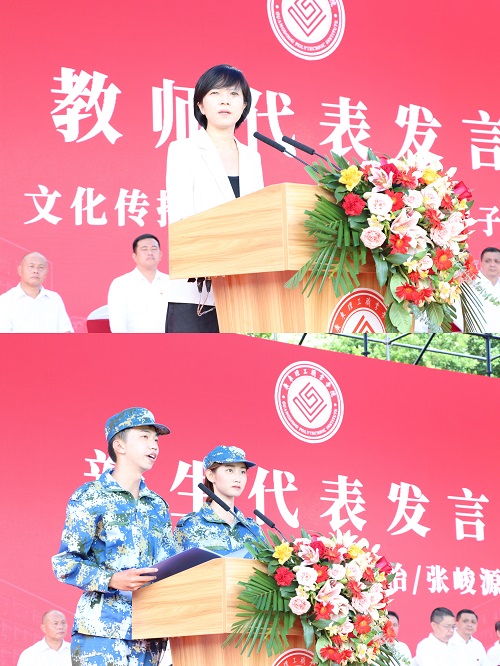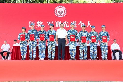 谢锦群宣读《关于表彰2023年新生军训先进集体及个人的决定》。孙平为2023年新生军训先进集体和个人代表颁奖。教师代表、新生代表先后发言,讲述教书育人的执着奉献,表达对大学生活的美好憧憬。