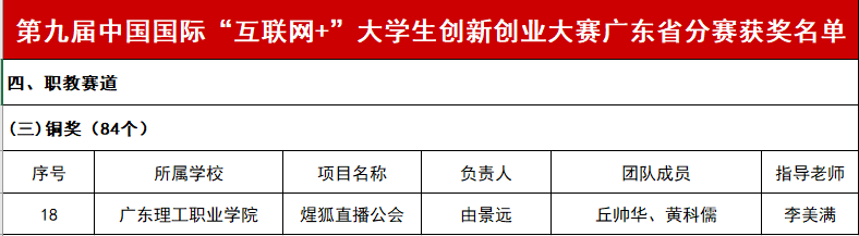 近日,广东省教育厅公布第九届中国国际“互联网+”大学生创新创业大赛广东省分赛获奖名单,学校人工智能学院副院长、教授李美满指导的项目“煋狐直播公会”喜获铜奖。