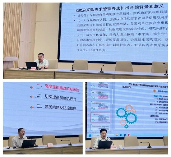纪检监察室负责同志结合学校实际,从“高度重视廉政风险防控”“切实提高制度执行力”“常见问题及防控措施”等方面介绍了招标采购工作廉政风险防控中的难点及应对措施,并要求参与采购工作人员树立法纪观念,加强底线思维,养成廉洁自律的好习惯,以规范的采购工作服务学校高质量发展。