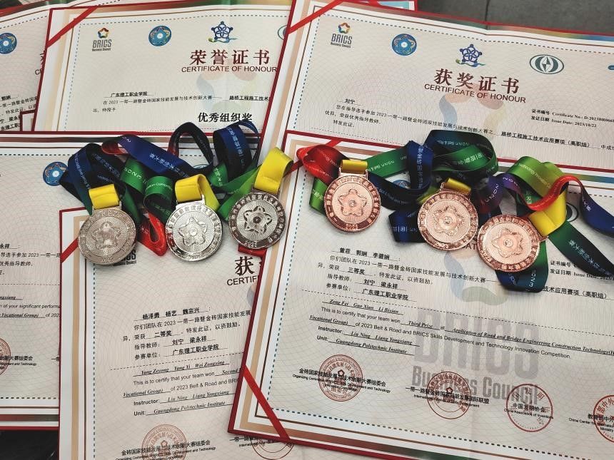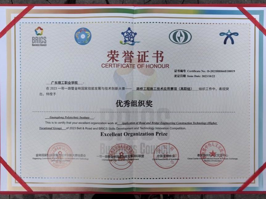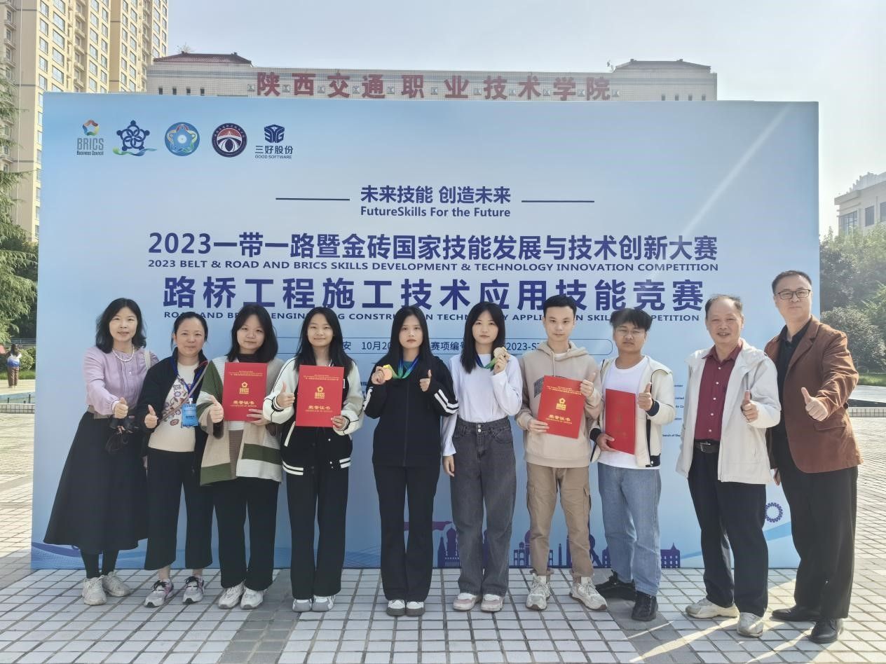 10月20至22日,2023第七届“一带一路”暨金砖国家技能发展与技术创新大赛之路桥工程施工技术应用技能竞赛决赛在陕西交通职业技术学院成功举办。经过激烈角逐,学校组织工作表现突出,被授予“优秀组织奖”,工程技术学院的两支参赛队伍从全国123所高职院校参赛者中脱颖而出,为学校新添“国字号”荣誉3项,其中项一队魏宗兴、杨泽勇、杨艺获全国二等奖;二队郭娴、曾菲、李碧娴获全国三等奖。工程技术学院党总支书记林卓歆带队参赛。